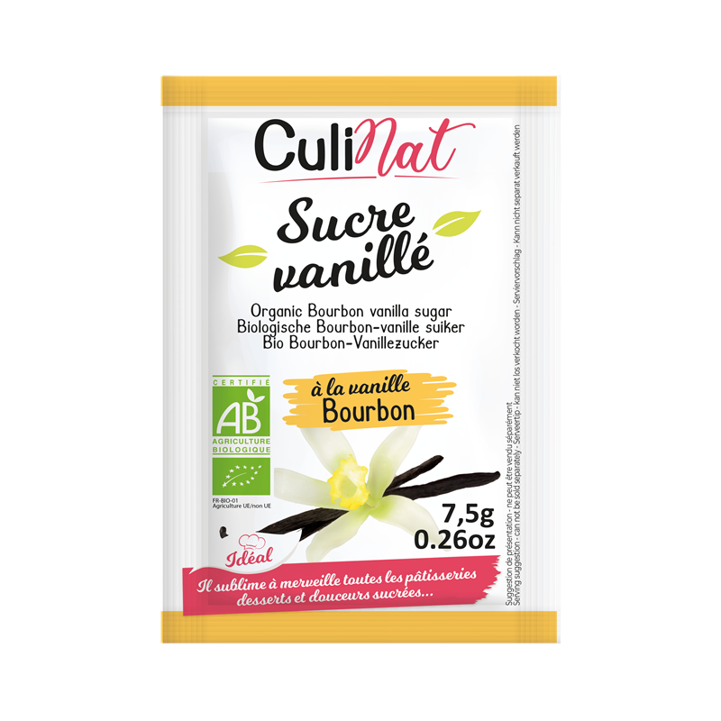 Sucre de canne blond*, amidon de blé*, extrait de vanille Bourbon*, écorces de vanille*. *Ingrédients Issus de lAgriculture Biologique.