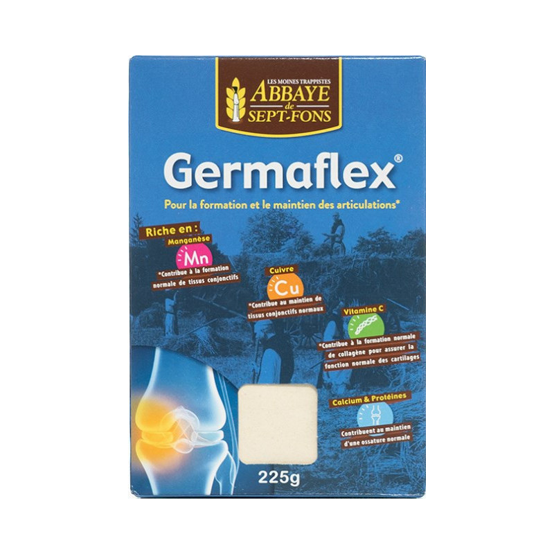 Germalyne (Germe de blé (Triticum vulgare) moulu), Poudre de Lithothamne (Phymatolithon calcareum), Sirop de Riz, Chlorhydrate de Glucosamine (Glucosagreen), Collagène Hydrolysé de Poisson, Chondroïtine Sulfate, Arômes Naturel, Extrait de Fruit d'Acérola (Malpighia glabra), Acide Hyaluronique, Bisglycinate de Cuivre.