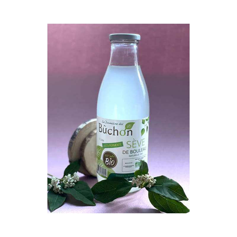 Sève de bouleau BIO LACTOFERMENTÉE, en bouteille verre de 1 litre. S'utilise en cure de 3 semaines à raison de 15 cl / jour le matin ajeun (soit 3 litres par cure).