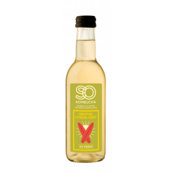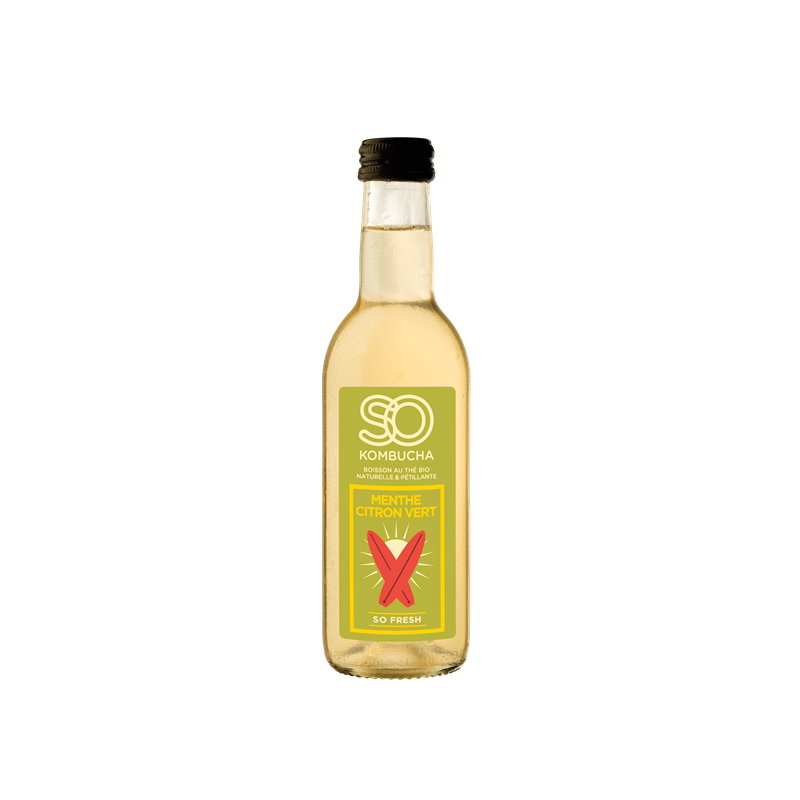Kombucha (eau filtrée, culture de Kombucha*, sucre de canne blond*, thé vert Sencha*), menthe fraîche*, jus de citron vert*