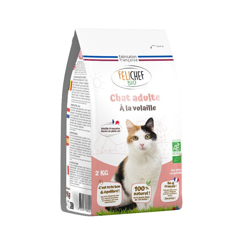 protéines de volailles déshydratées*, sorgho*, tourteau de soja*, protéines de riz*, graisse de volaille*, maïs*, blé*, orge*, son de blé*, gluten de blé*, fibres de pommes*, chlorure de potassium, produit de levure saccharomyces cerevisae (riche en béta-glucans), mélange de plantes riches en saponines, tomate fruit*, thé vert*, carotte*, romarin*, persil*, sauge *, * produit issu de lagriculture biologique