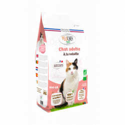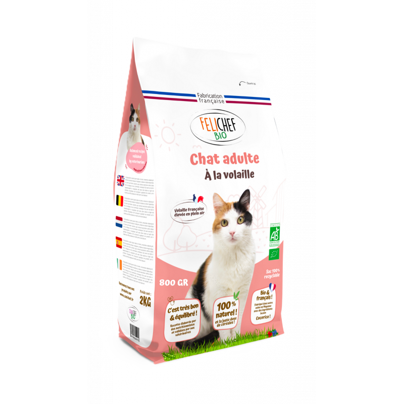 protéines de volailles déshydratées*, sorgho*, tourteau de soja*, protéines de riz*, graisse de volaille*, maïs*, blé*, orge*, son de blé*, gluten de blé*, fibres de pommes*, chlorure de potassium, produit de levure saccharomyces cerevisae (riche en béta-glucans), mélange de plantes riches en saponines, tomate fruit*, thé vert*, carotte*, romarin*, persil*, sauge *, * produit issu de lagriculture biologique