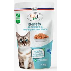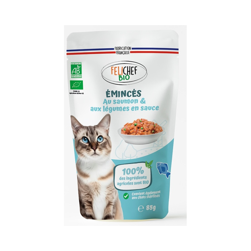 Viandes* et sous-produits animaux*30%, Céréales*, Poissons* et sous-produits de poissons*4% (dont saumon* 4%), Légumes* (dont carottes* et petit pois* 4%), Extraits de protéines végétales*, Substances minérales*, Sucres*. * ingrédients issus de l'agriculture biologique. 100% des Matières Premières d'origine agricole sont issues de l'agriculture biologique.