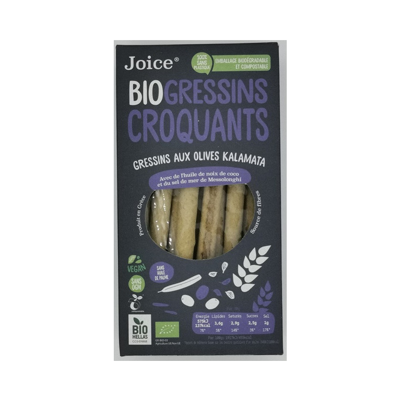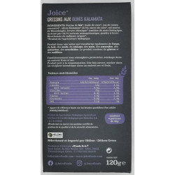 Farine de blé*, huile de coco*, jus de raisin concentré*, olive Kalamon* (3.7%), sucre de coco*, sel marin de Messolonghi, levure chimique* (amidon de maïs biologique, tartrate pur 24.7 %, tartrate monopotassique, poudre à lever : Bicarbonate de sodium), origan*. *Produit de lagriculture biologique.