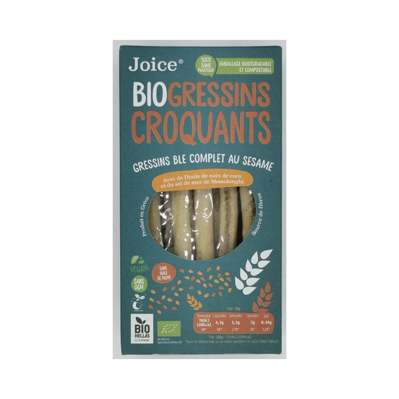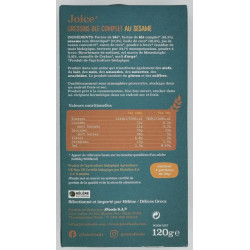 Farine de blé*, farine de blé complet* (18.2%), sésame non décortiqué* (17.3 %), huile de coco* (10.9%), jus de raisin concentré*, sucre de coco*, poudre à lever* (amidon de maïs biologique, tartrate pur 24.7 % monopotassium, poudre à lever : Bicarbonate de sodium), sel marin de Messolonghi (1.8%), canelle de Ceylan*, malt dorge*. *Produit de lagriculture biologique.