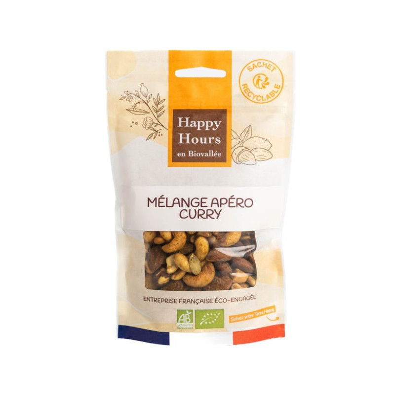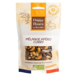 Arachides*, noix de cajou*, amandes*, noisettes*, graines de courge*, sauce Tamari* (soja*, sel), curry*, ail*, oignon*. * Bio certifié par FR-BIO-10.
