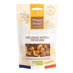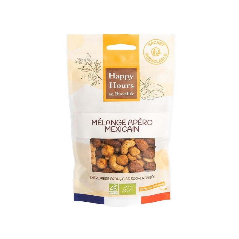 Arachides*, noix de cajou*, amandes*, noisettes*, graines de courge*, farine de pois chiche*, épices* poudre 1% : tomate*, paprika*, piment de Cayenne*, coriandre*, cumin*, citron*, fenugrec*, oignon*, sel, macis*, ail*, curcuma*, gingembre*, piment doux d'Espagne*, girofle*, cannelle*, laurier*. * Bio certifié par FR-BIO-10.