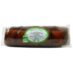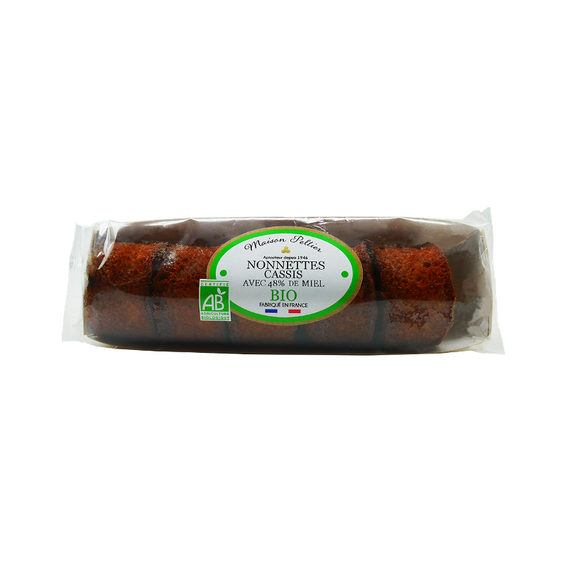 Miel de fleurs 48% BIO, farine de BLE de France BIO, sucre de canne BIO équitable, purée de cassis BIO 12%, OEUFS entiers de France BIO,