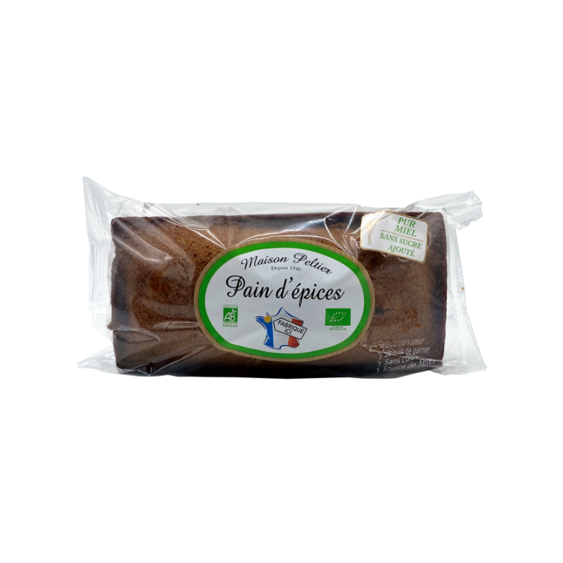 Miel de fleurs BIO 55%, farine de BLE française BIO, OEUFS entiers de France BIO, BEURRE de France BIO, poudres à lever : bicarbonates de sodium et d'ammonium, épices BIO.