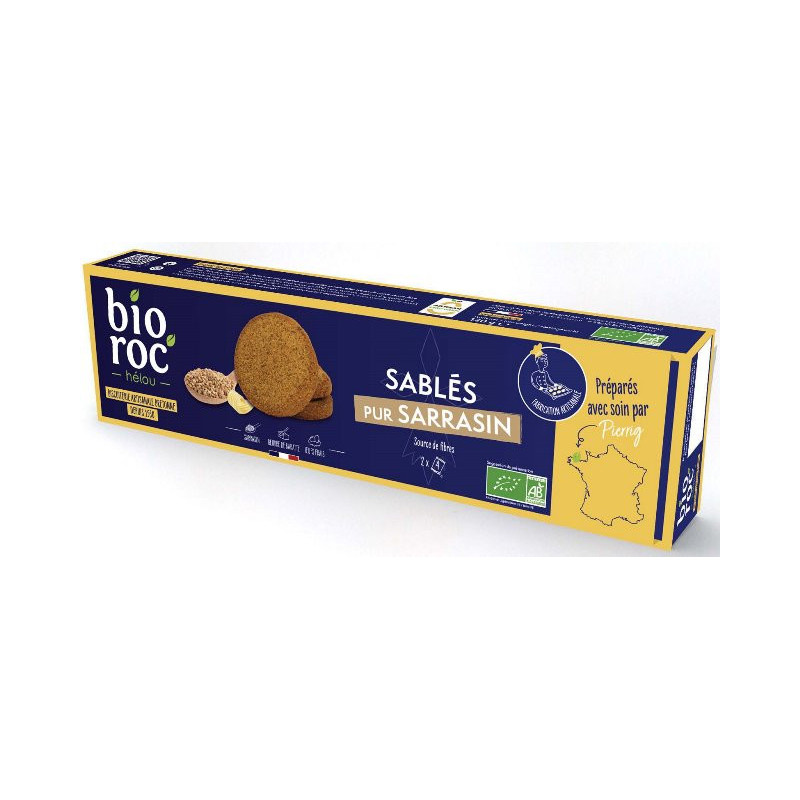 Farine de sarrasin* 49,3% (FR), beurre doux de baratte* 31% (FR), sucre de canne blond non raffiné*, ufs entiers* 10,5% (FR), sel marin gris de Guérande.