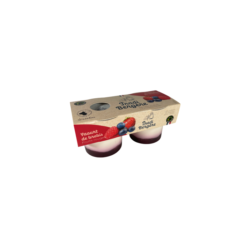 *Lait entier de brebis pasteurisé 84%, *sucre de canne blond 8%, *fraises 3,2%, *framboises 2,9%, *myrtilles 1,9%, *agar-agar, ferments lactiques. *Ingrédients issus d'une agriculture biologique.