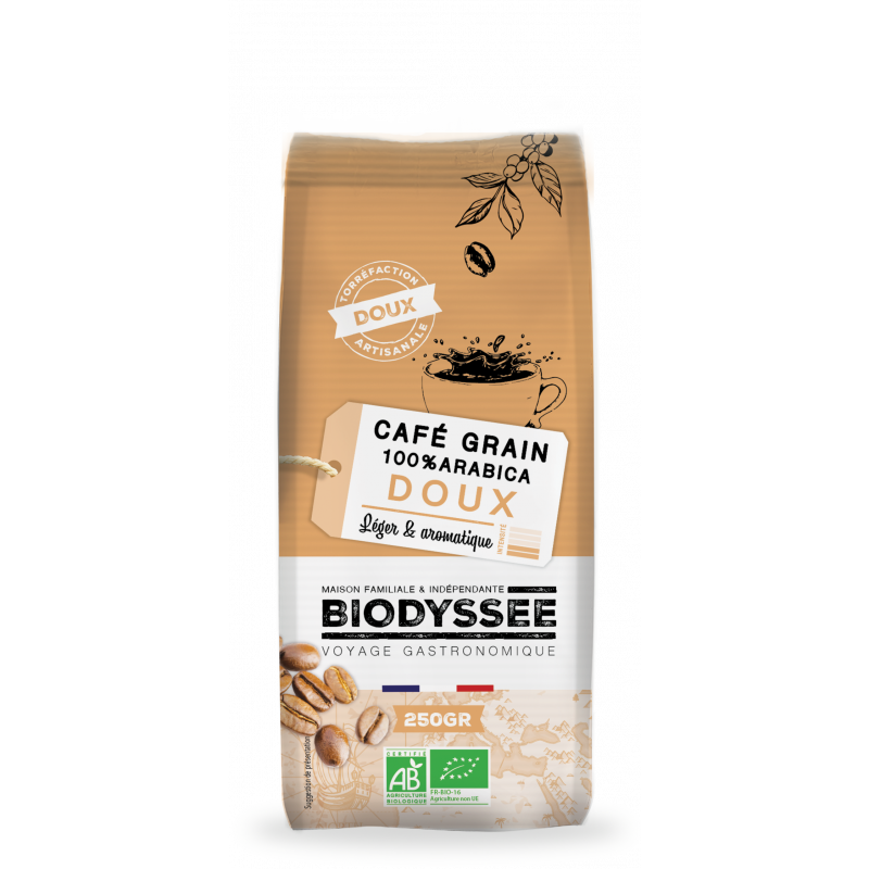 Notre café grain pur arabica Doux" est torréfié en France de manière artisanale. Grâce à une torréfaction légère dite blonde, les grains conservent une couleur claire et des arômes subtils. Cette torréfaction permet dobtenir une tasse légère, plus digeste et sans amertume avec une pointe dacidité. Elle développe de délicates notes fruitées et florales."