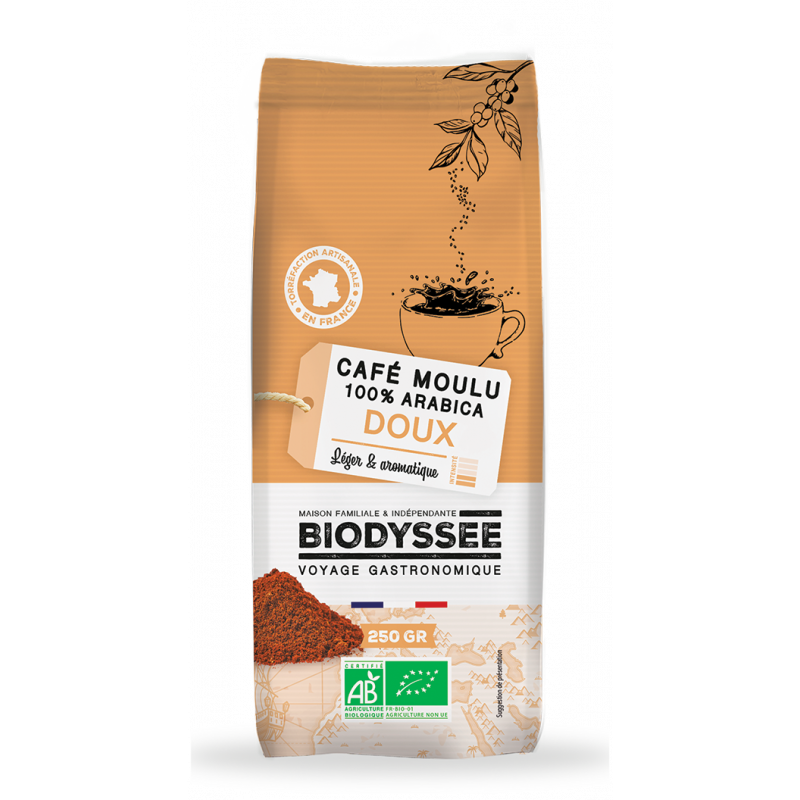 Notre café moulu pur arabica Doux" est torréfié en France de manière artisanale. Grâce à une torréfaction légère dite blonde, les grains conservent une couleur claire et des arômes subtils. Cette torréfaction permet dobtenir une tasse légère, plus digeste et sans amertume avec une pointe dacidité. Elle développe de délicates notes fruitées et florales."