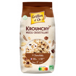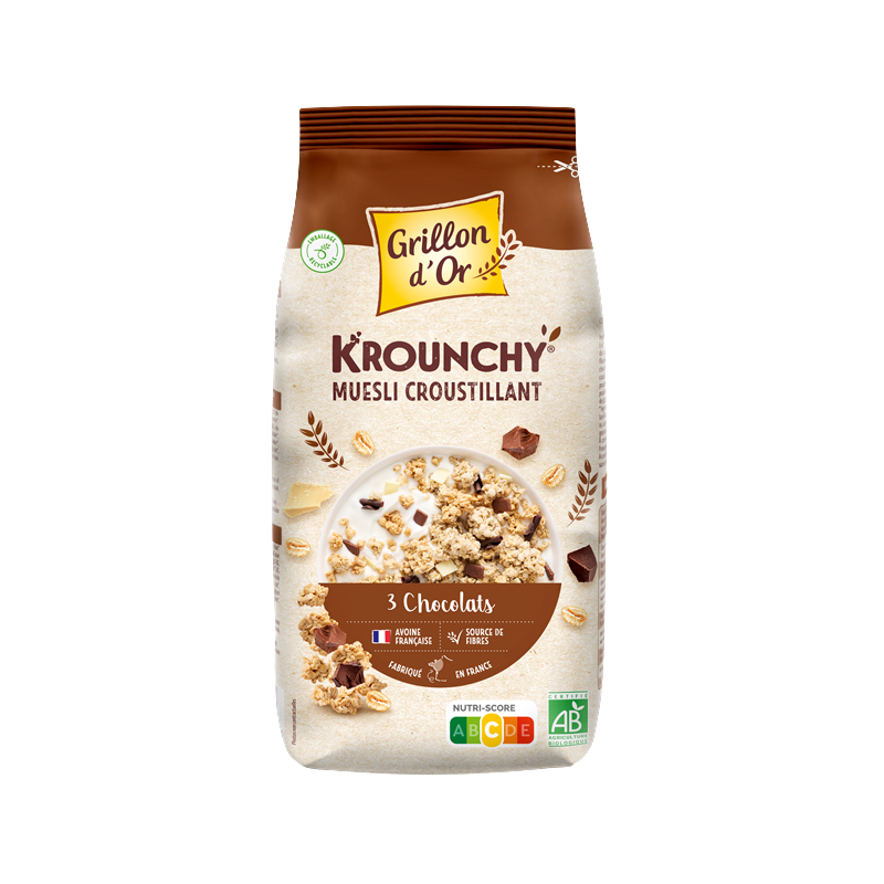 Flocons d'avoine complets* 42%, billettes de céréales* (riz*,blé complet*, avoine complète* 0,9%, sucre de canne*, sel), sucre de canne*, huile de tournesol*, sirop de riz*,farine de blé*,flocons de blé complets*,flocons d'orge complets*, copeaux de chocolat noir* 3% (masse de cacao*, sucre de canne*, beurre de cacao*), morceaux de chocolat blanc* 3% (sucre de canne*, beurre de cacao*, poudre de lait entier*), morceaux de chocolat au lait* 3% (sucre de canne*,poudre de lait entier*, masse de cacao*, beurre de cacao*, poudre de lactosérum*, émulsifiant : lécithine de tournesol*), vanille*.