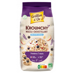 Pétales de blé*, flocons d'avoine complets* 15%, flocons de blé complets*, flocons de seigle complets*, farine de blé*, purée de cacahuètes*, pommes séchées* 6,5%, billettes de riz* (riz*, sel), jus de citron*, cassis lyophilisés* 2%, antioxydant : extrait de romarin*.