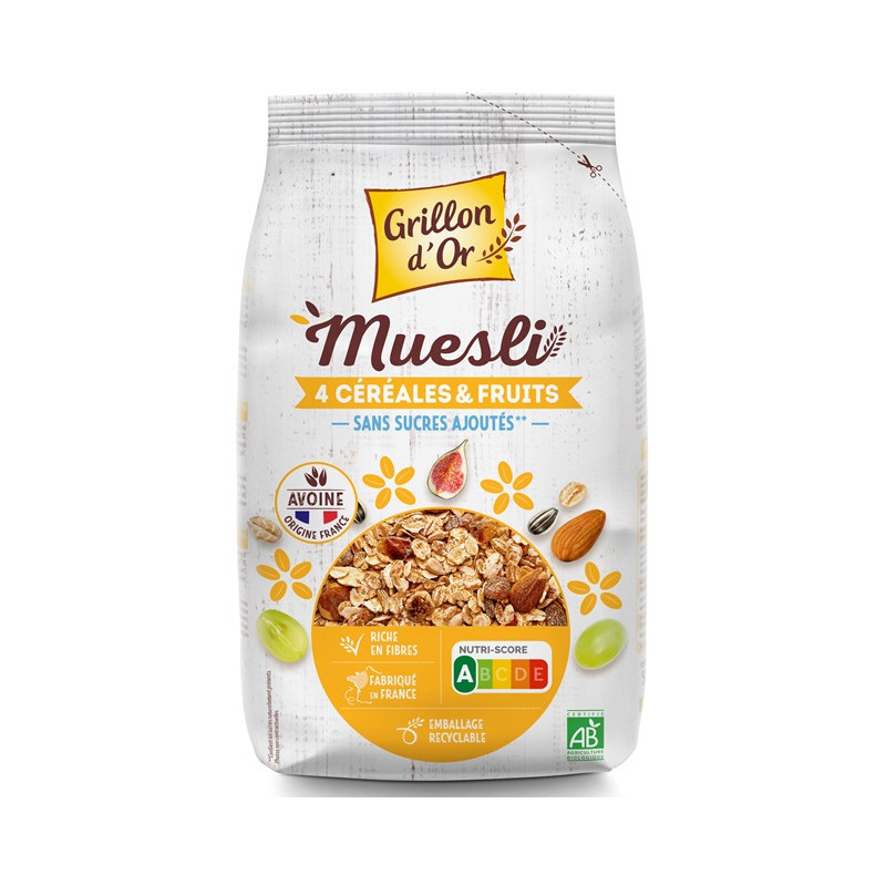 flocons davoine complets 18% ,flocons de blé complets 18% ,flocons de seigle complets 18% ,flocons d'orge complets 18% ,graines de tournesol 10% ,raisins secs (raisins 7,9%, huile de tournesol) ,figues séchées (figues 2,8%, farine de riz) ,dattes séchées (dattes 2,8%, farine de riz) ,kasha 2% ,amandes toastées 2%
