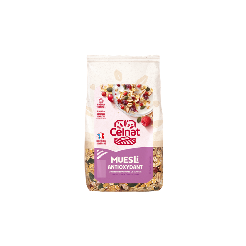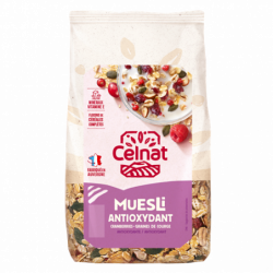 Flocon Kamut toasté 39% ,Flocon d Avoine 7.425% ,Flocon de blé toasté 7.35% ,Flocon d orge toasté 7.35% ,Flocon de Seigle toasté 4.425% ,Flocon de riz toasté 2.95% ,Cranberries 14% ,Noisettes Toastées 5% ,Graines de Courges 6% ,Kamut soufflé 3% ,Sésame toasté 2% ,Framboise 100% ,Groseille 50% issus de l'agriculture biologique.