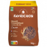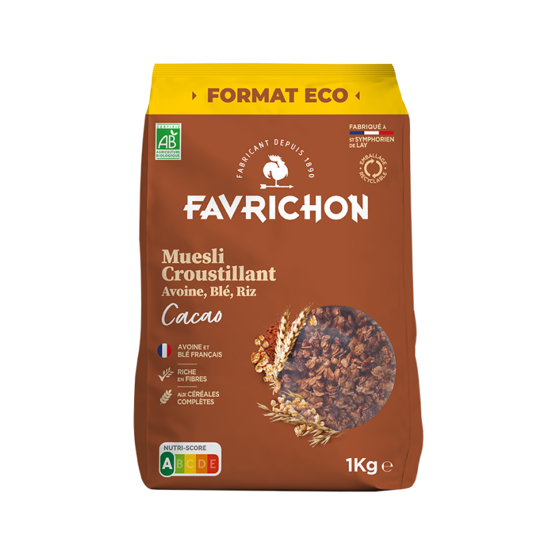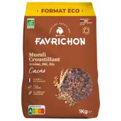 Céréales* complètes 72.9% (avoine*, blé*, riz), sucre de canne* non raffiné issu du commerce équitable, huile de tournesol*, cacao* maigre en poudre 2,6% issu du commerce équitable. *Ingrédients issus de l'agriculture biologique.