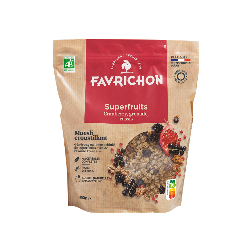 complet non raffiné, superfruits* 9,6% (cranberries* 5% (cranberries*, sucre de canne*, huile de