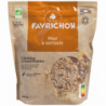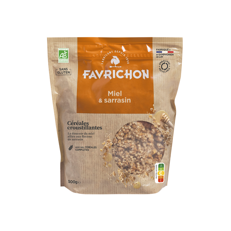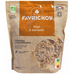 céréales* 63,8% [flocons de sarrasin* complets 18,5%, flocons de riz* complets 18,5%, riz*, corn* flakes (maïs*, sucre de canne*, sel de mer), riz* complet 6%, farine de sarrasin* 2%], sucre de canne* complet non raffiné, huile de tournesol* (tournesol*, antioxydant : extrait de romarin*), miel* 5%, noisettes* hachées grillées, sucre de canne*. *Ingrédients issus de lagriculture biologique.
