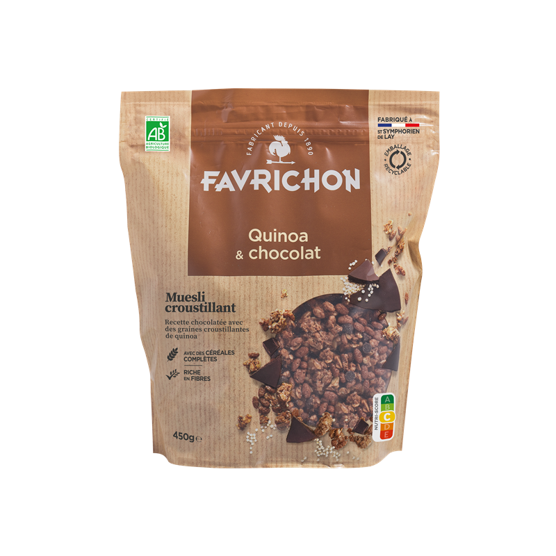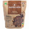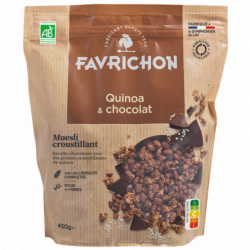 céréales* 51,8 % (flocons d'avoine* complets, riz*, flocons d'épeautre* complets, farine d'épeautre* complète), sucre de canne* non raffiné, pépites de chocolat* 11% (pâte de cacao*, sucre de canne*, beurre de cacao*, extrait de vanille*), huile de tournesol* (tournesol*, antioxydant : extrait de romarin*), noix de coco* râpée, quinoa* 4,3%, sirop d'épeautre*, cacao* maigre en poudre. *Ingrédients issus de lagriculture biologique.