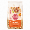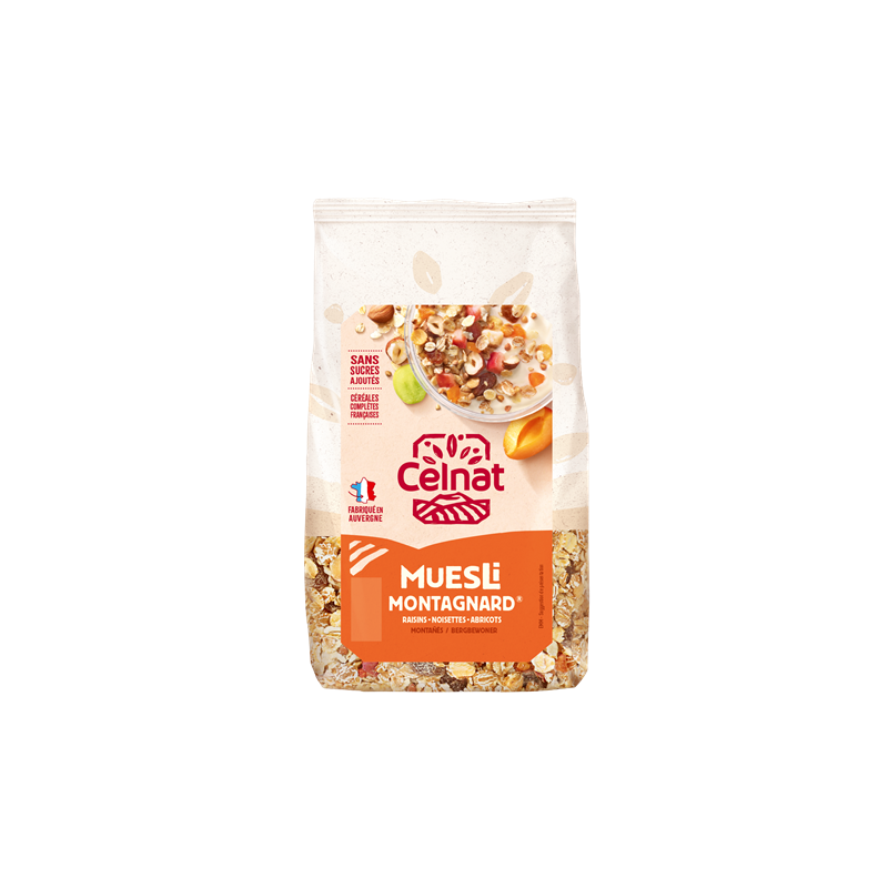 Sarrasin Grillé KASHA 5% ,Flocon de soja toasté 3% ,Flocon de Millet 5.2% ,Sésame blond toasté 5.2% ,Graine de tournesol 2.6% ,Flocon d Avoine 15.75% ,Flocon de blé toasté 15.75% ,Flocon d orge toasté 15.75% ,Flocon de Seigle toasté 9.45% ,Flocon de riz toasté 6.3% ,Raisins secs 17% ,Noisettes Toastées 3% ,Pommes 2.5% ,Abricots secs 1.5% issus de l'agriculture biologique.