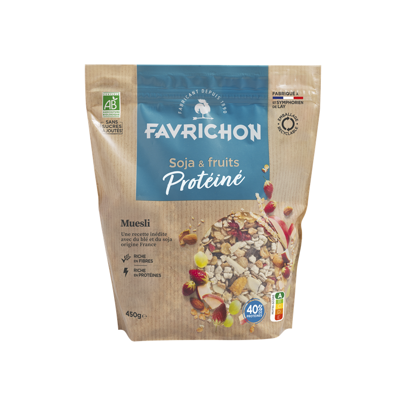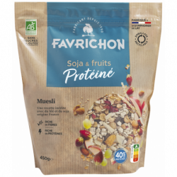 (maïs*, sel de mer)], flocons de soja* 18,8%, fruits* 18,2% [raisins* 11,2% (raisins*,