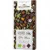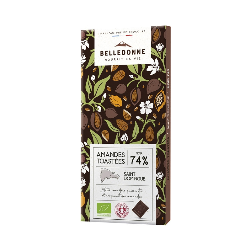 Chocolat noir* (pâte de cacao*, sucre de canne blond*, beurre de cacao*, poudre de cacao*, vanille*), éclats d'amandes toastées* (10%).