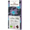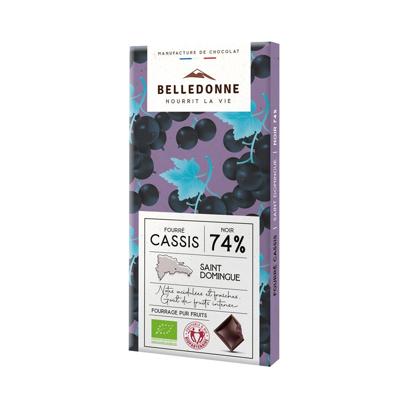 Chocolat noir* (pâte de cacao*?, sucre de canne blond*, beurre de cacao*, poudre de cacao*, vanille*), fourrage cassis* (sucre de canne roux*, purée de cassis* (10%), beurre de cacao*, sirop de maïs*, eau).