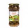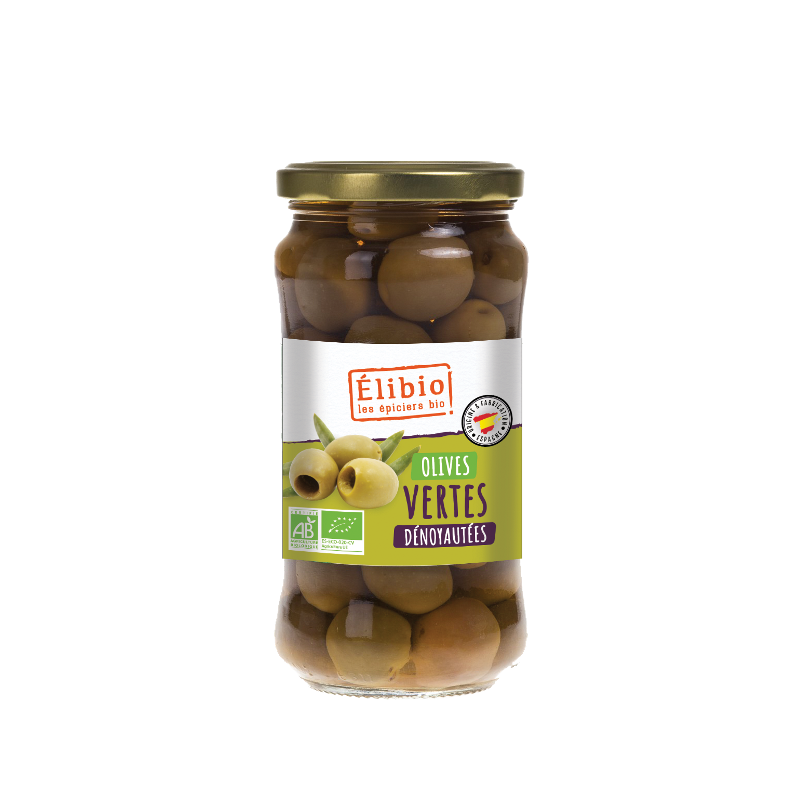 Olive verte dénoyautée*, eau, sel, vinaigre*, acidifiants : acide citrique et acide lactique.