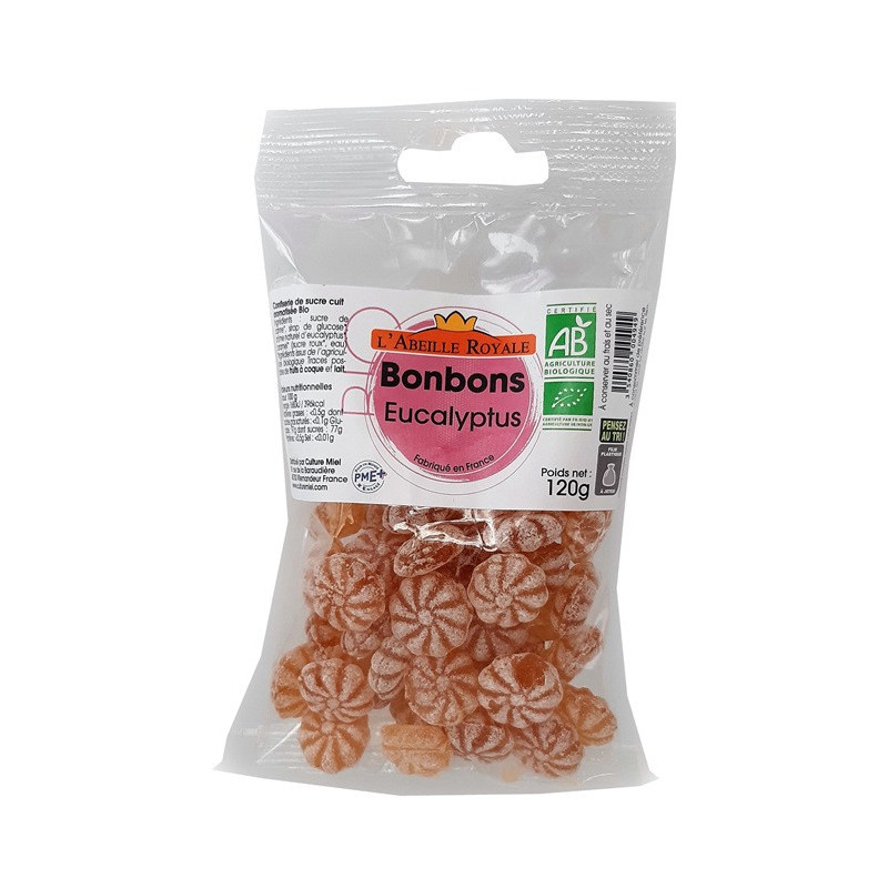 Sucre de canne*, sirop de glucose*, arôme naturel d'eucalyptus*, caramel* (sucre roux*, eau). * : Ingrédients issus de l'agriculture biologique