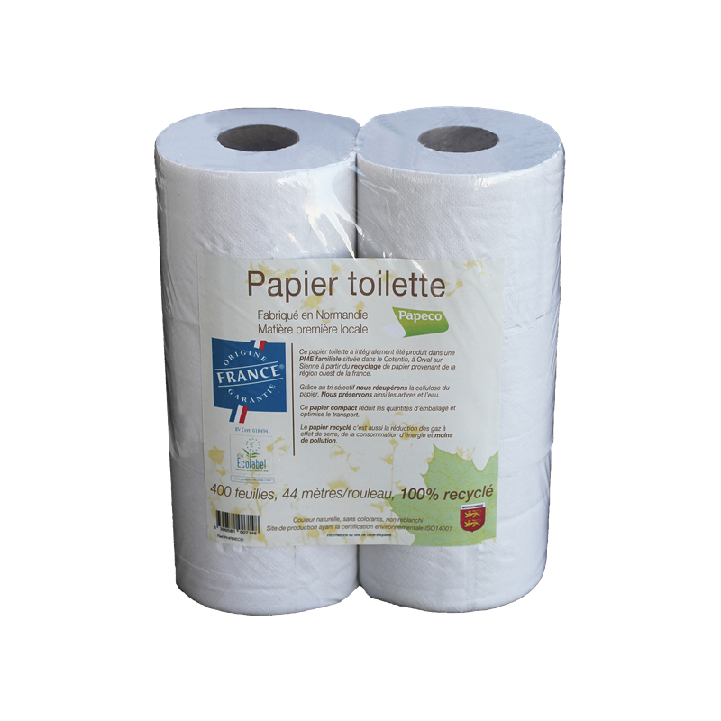 Ce papier toilette a intégralement été produit dans une PME familiale dont le capital est détenu à 100% par les salariés. Située dans le Cotentin, à Orval sur Sienne à partir de papier de corbeille de bureau recolté localement . Pas de désencrage chimique , pas de blanchiment , pas de colorant, pas de chlore . Ecolabel , certifié Origine France Garantie ( seule certification légale et contrôlée de provenance). Par souci de transparence, il n'est pas indiqué 6 =12 etc... Mais directement le nombre de feuilles afin de vous permettre de comparer et de vérifier . Prix à la feuille le plus compétitif