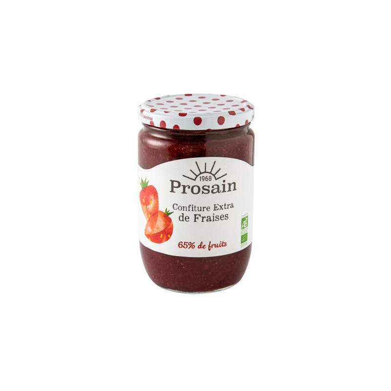 Fraises*, sucre de canne non raffiné*, agent gélifiant : pectine de fruits, jus concentré de citron*. *Ingrédients issus de l'agriculture biologique. Souligné : commerce équitable contrôlé Fair For Life. 49% du total des ingrédients sont issus du commerce équitable Préparée avec 65g de fruits pour 100g. Teneur totale en sucres: 55g pour 100g