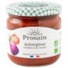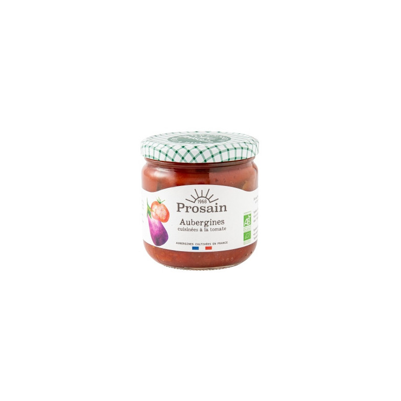 aubergines* en tranches frites (50% minimum), tomate* 35% (pulpe*, concentré*), eau, huile de tournesol* désodorisée, oignons* 1%, sucre de canne non raffiné*, ail*, sel de mer, échalote*, épices*.