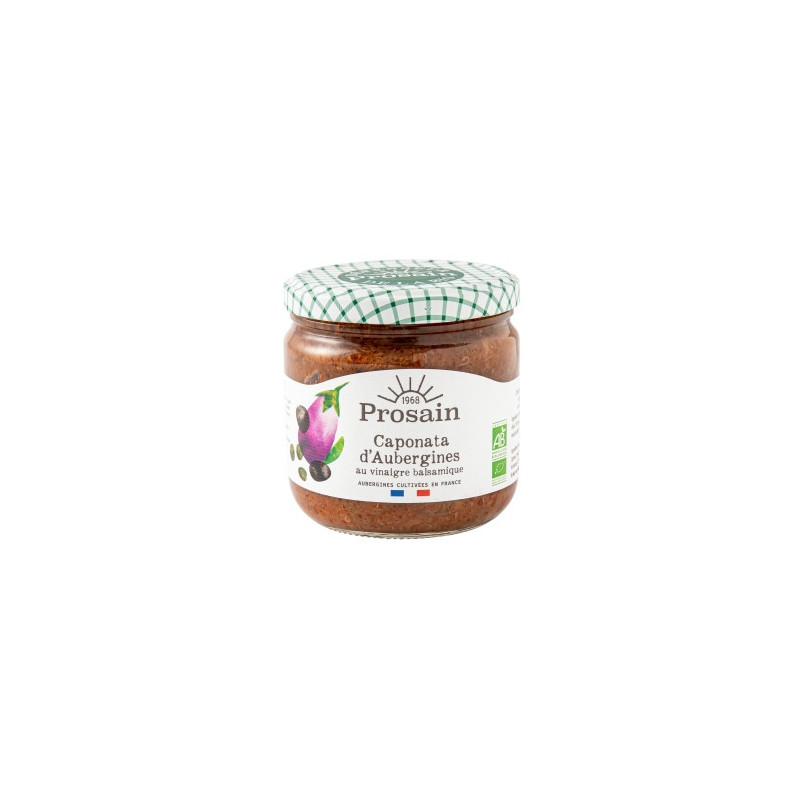 aubergines* 46%, tomate* 18% (pulpe, concentré), oignons*, huile d'olive* vierge extra extraite à froid, olives* 5% (vertes, noires ), céleri*, capres* 3%, vinaigre balsamique* (vinaigre de vin*, mout de raisin concentré*, mout de raisin cuit*), miel*, sel de mer, poivre*.