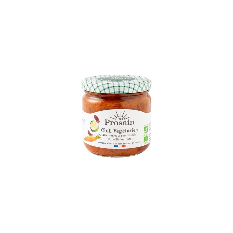 Tomate* 25% (pulpe*, concentré*), eau, haricots rouges réhydratés* 11%, courgettes*, carottes* 7%, oignons*, poivrons* 6%, protéines de soja* 5%, pois chiches* réhydratés, huile d'olive* vierge extra extraite à froid, épices* (dont piment de cayenne 0,03%), sel de mer, ail*, basilic*.