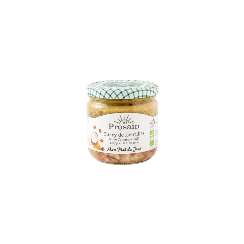 eau, lait de coco* 19%, lentilles* 15%, oignons* 12%, riz complet*, carottes*, huile de tournesol* désodorisée, fécule de pomme de terre*, épices* 0,65%, sel de mer, jus concentré de citron*, ail*.