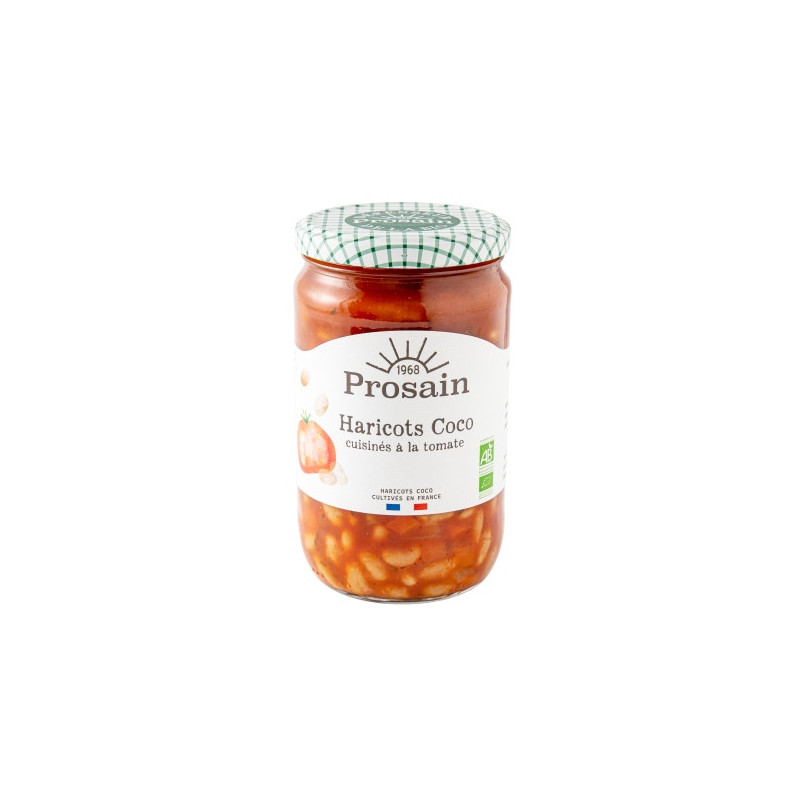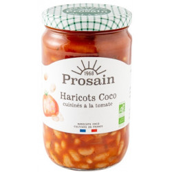 haricots coco* réhydratés 27,2%, coulis de tomate* 24,7%, eau, légumes* 22,8% (oignons*, carottes*), huile