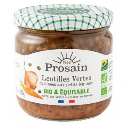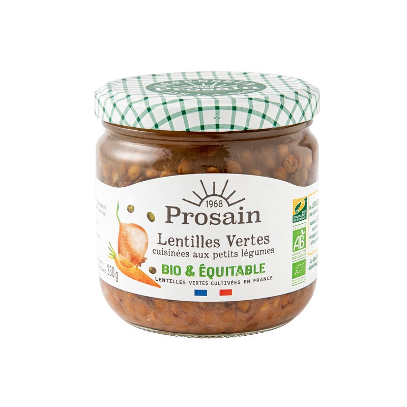 Lentilles vertes* 60%, eau, légumes* 4% minimum (oignon*, poireau*, carotte*), sel de mer, échalote*