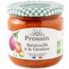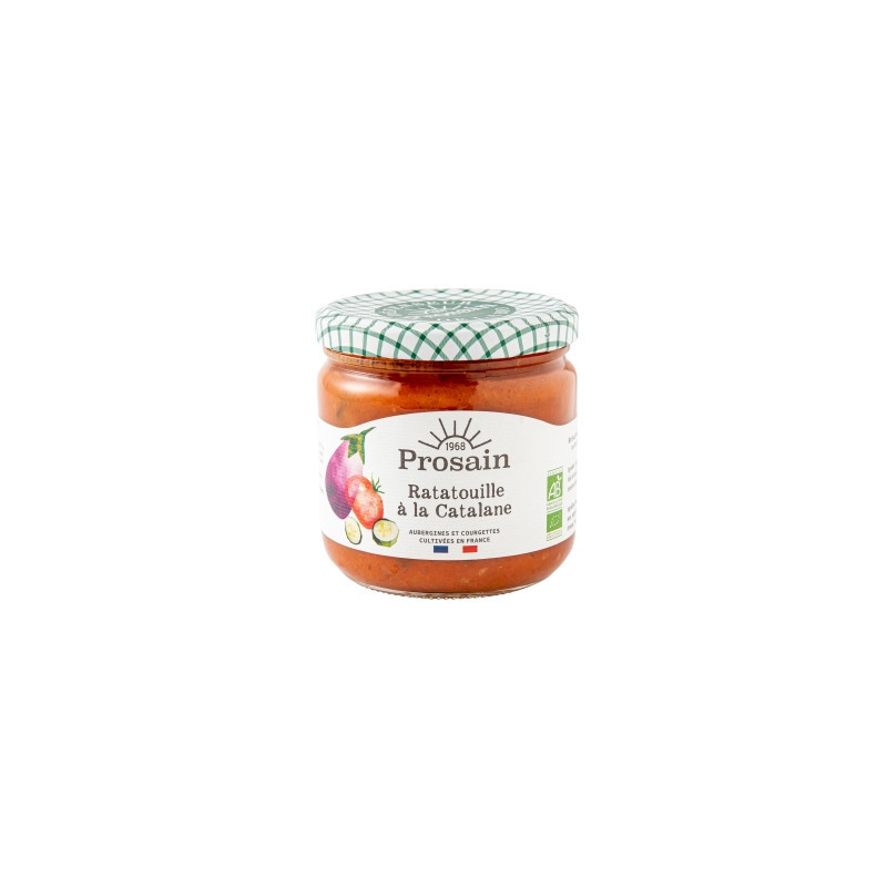 tomate* 26% (pulpe*, concentré*), aubergines* frites 21%, courgettes* frites 21%, oignons*, eau, huile de tournesol* désodorisée, poivrons* rouges 4%, sel de mer, huile d'olive* vierge extra extraite à froid, jus concentré de citron*, ail*, échalote*, épices*, plantes aromatiques*.
