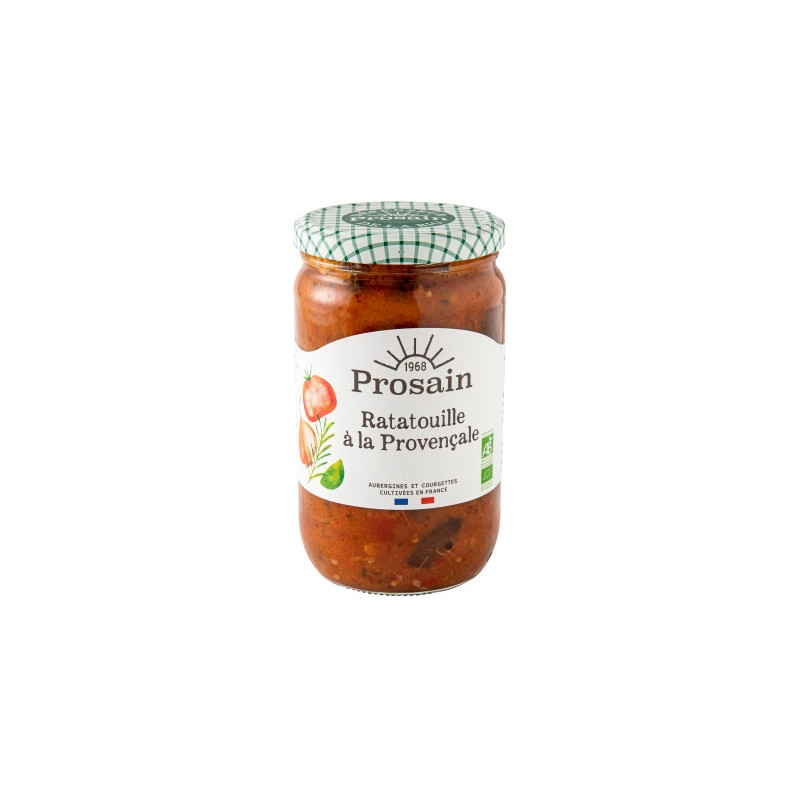tomate* 28% (dés de tomates*, pulpe*, concentré*), aubergines* 25%, courgettes* 17% , poivrons* rouges 10%, oignons*, huile de tournesol* désodorisée, ail*, sel de mer, huile d'olive* vierge extra, plantes aromatiques*, miel*, jus concentré de citron*, poivre*.