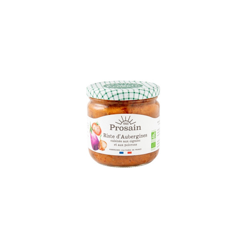 aubergines* en tranches frites 54%, pulpe de tomate* 30%, oignons* 8%, huile de tournesol* désodorisée, poivrons rouges*, sirop de riz*, sel de mer, ail*, huile d'olive* vierge extra extraite à froid, jus concentré de citron*, thym*, poivre*.