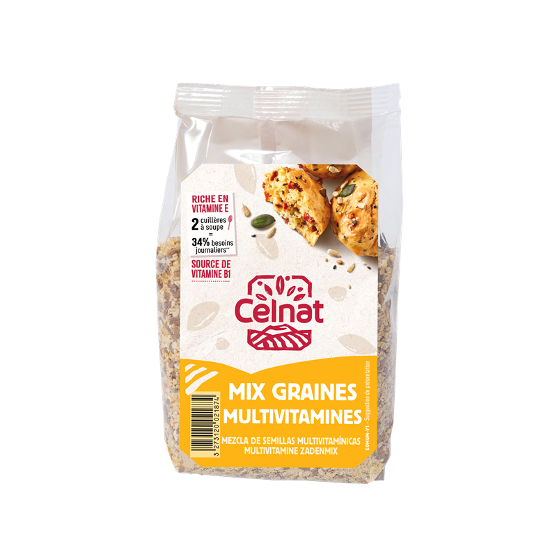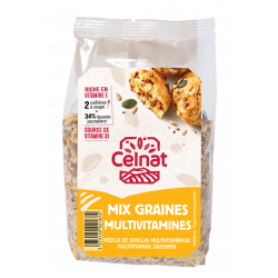 Graine de tournesol 40% ,Sarrasin Grillé KASHA 22% ,Graine de courge 16% ,Sésame blond toasté 11% ,Sésame Noir Toasté 11% issus de l'agriculture biologique.
