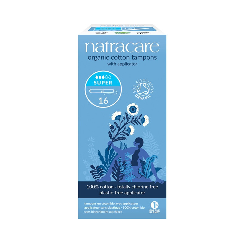 Tampons en coton bio, emballés individuellement en polyéthylène recyclable. Paquet en carton recyclable.