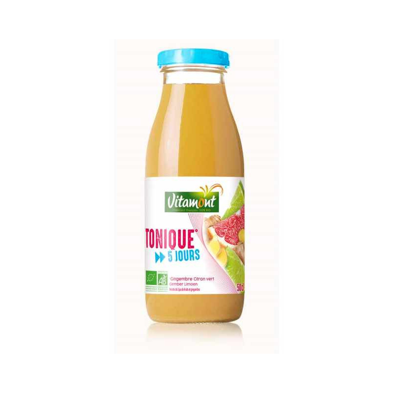 jus de pomme* (67%), jus de pamplemousse rose* (21,9%), jus de gingembre* (7,5%), jus de citron vert* (3,5%), extrait de gingembre*.