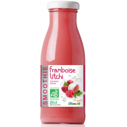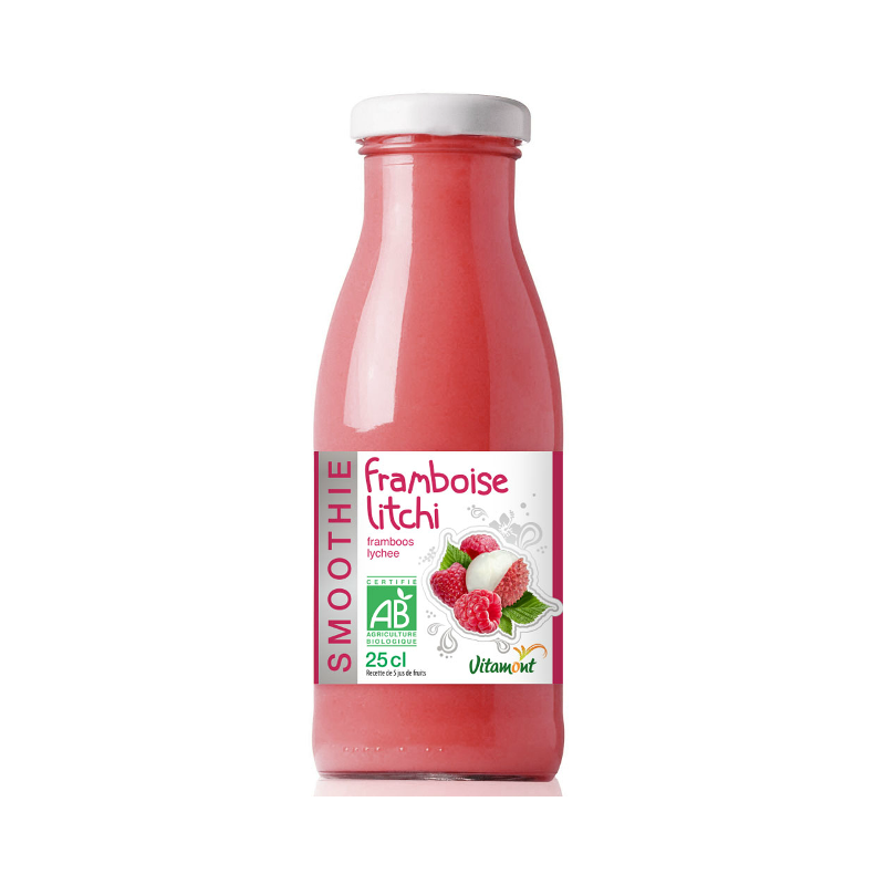jus de pomme* (50%), purée de banane* (19,5%), purée de framboise* (16,5%), jus de litchi* (11%),