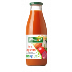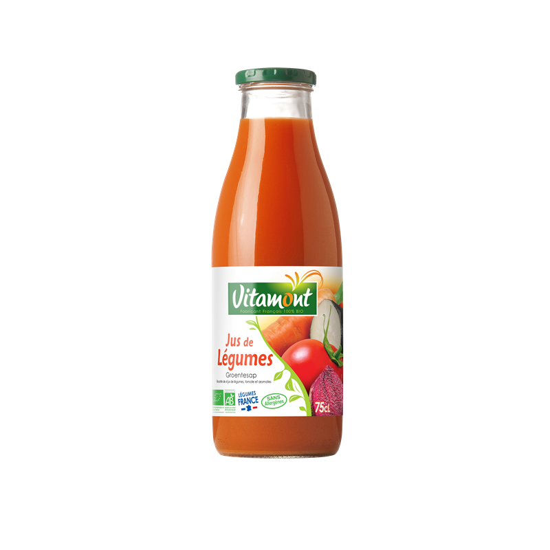 jus de tomate* (78%), jus de carotte* (carotte*, jus de citron* concentré) (16%), jus de betterave* (betterave*, jus de citron* concentré) (2,73%), jus de fenouil* (fenouil*, jus de citron*) (2%), jus de citron* (1%), sel de Guérande (0,27%).