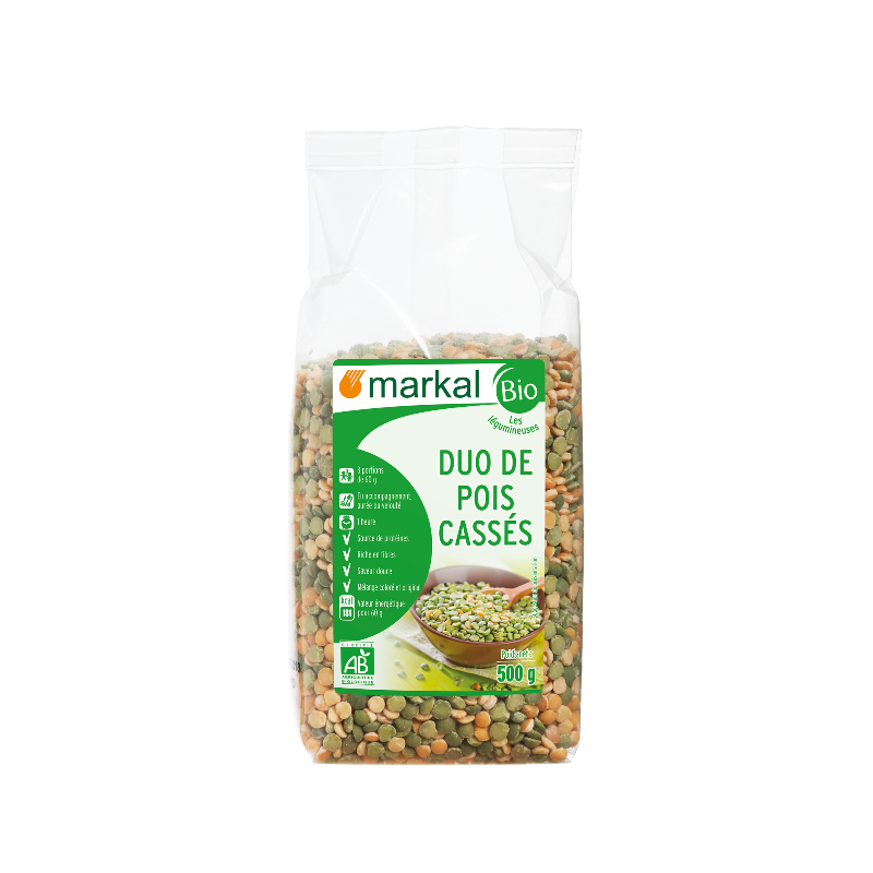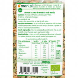 Pois cassés verts*, pois cassés jaunes*. *Issus de l'agriculture biologique.