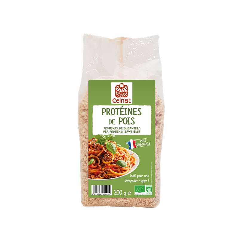 Ces protéines sont confectionnées à partir de pois jaunes cultivés en France. Ces protéines de pois seront une alternative idéale aux protéines de soja et s'utiliseront simplement de la même façon.