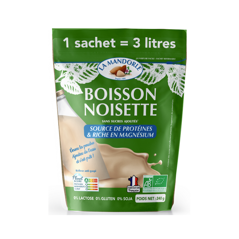 Noisettes* Déshuilées Partiellement 40% d'Italie, Sirop de Riz* Déshydraté, Farine de Riz*, Fibre d'Acacia*.*Issus de l'Agriculture Biologique.